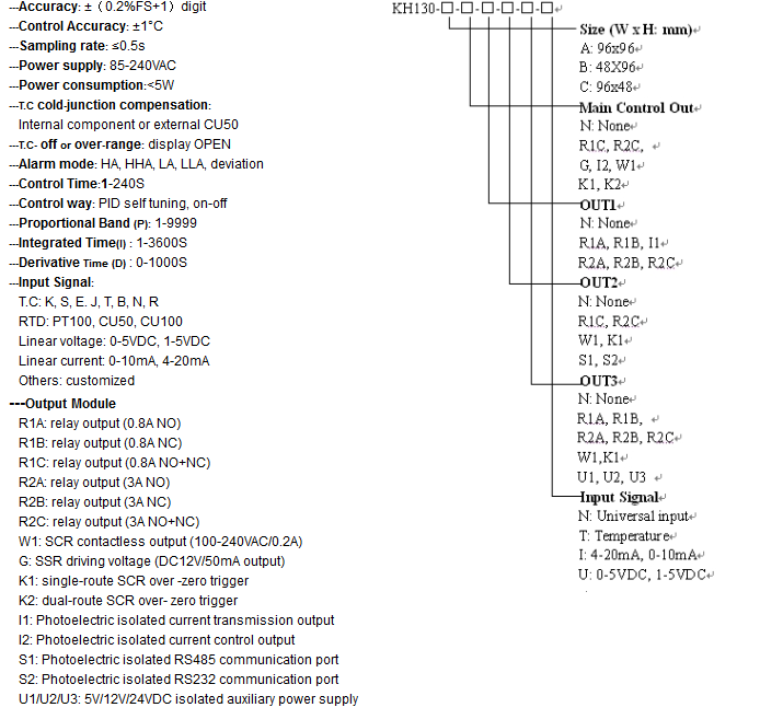 E.g.: KH130-A-R2C-I1-R2C-R2A-N, model: KH101, 96x96mm A relay control output: NO+NC, 2 relay alarm output, 4-20mA retransmission output, universal input, 85-240VAC power supply